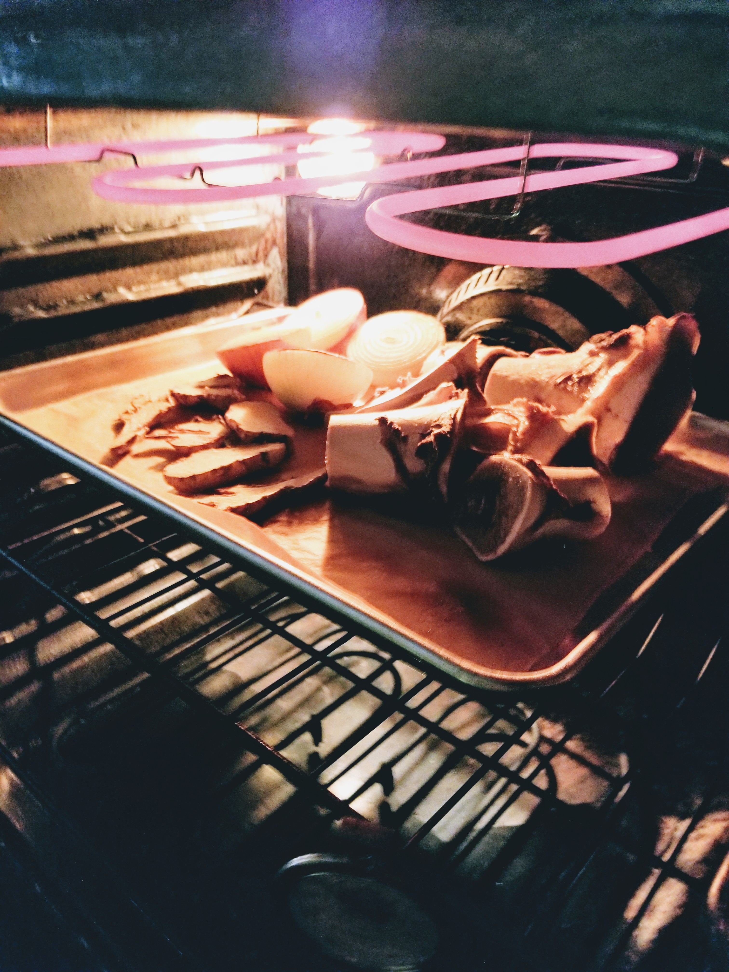 Roast the bones and aromatics in the oven for 20-25 minutes, turning to ensure all sides are browned. The finished roasting in the oven. - In sauté pan, heat the star anise, cinnamon and cloves over medium heat, stirring frequently until the mixture becomes fragrant. Remove from heat and cool. Once cool, wrap the spices in cheesecloth or pack in an herb sachet.